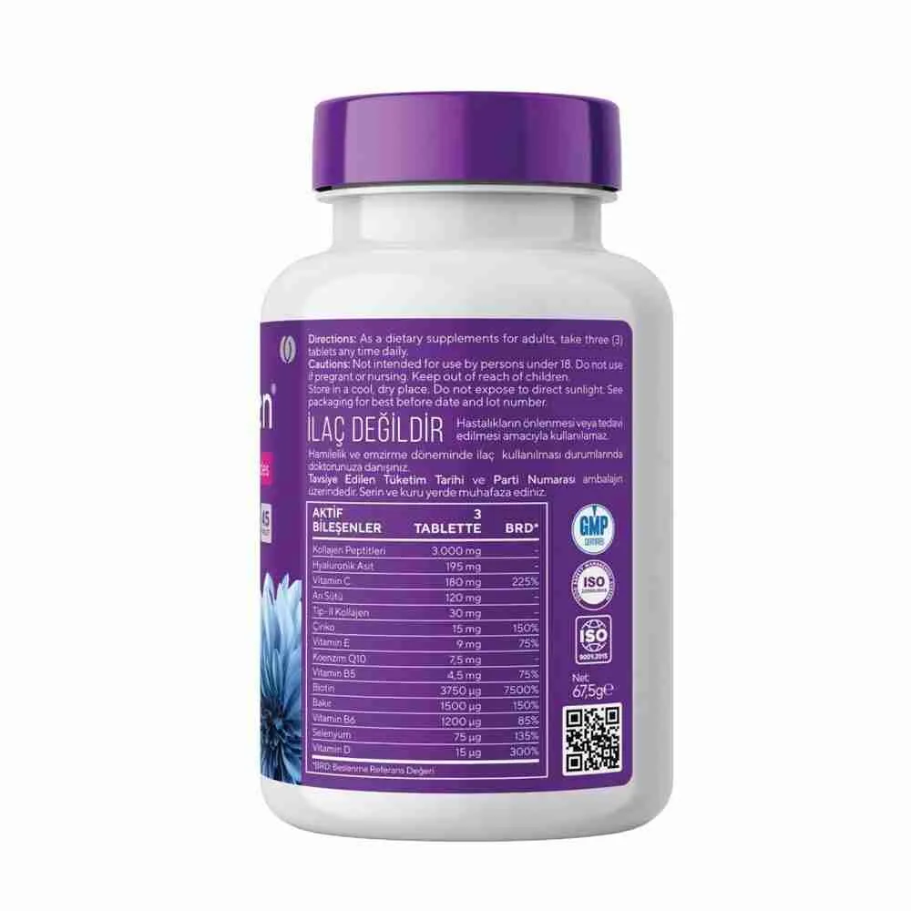 بالإضافة إلى محتوى الكولاجين ، هناك أيضًا مكونات فيتامين ج وحمض الهيالورونيك والزنك والبيوتين في تركيبة أقراص الكولاجين هذه، والتي تم تطويرها من قبل الخبراء.