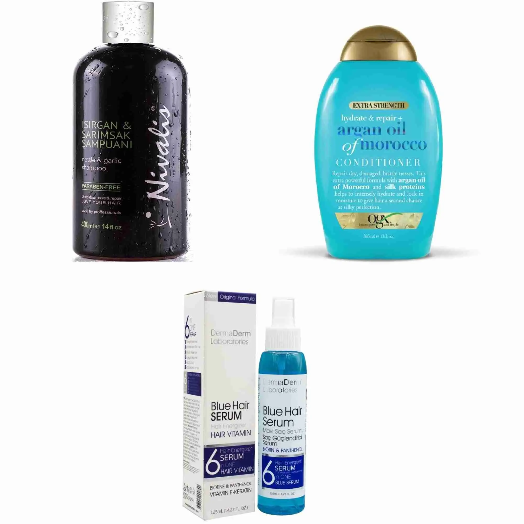 يقوم سيروم الشعر الأزرق, سيروم الشعر التركي, فيتامين الشعر, بيوتين, بانثينول, فيتامين إي كيراتين بتغذية بصلات الشعر بالمواد التي يؤدي فقدانها إلى الصلع