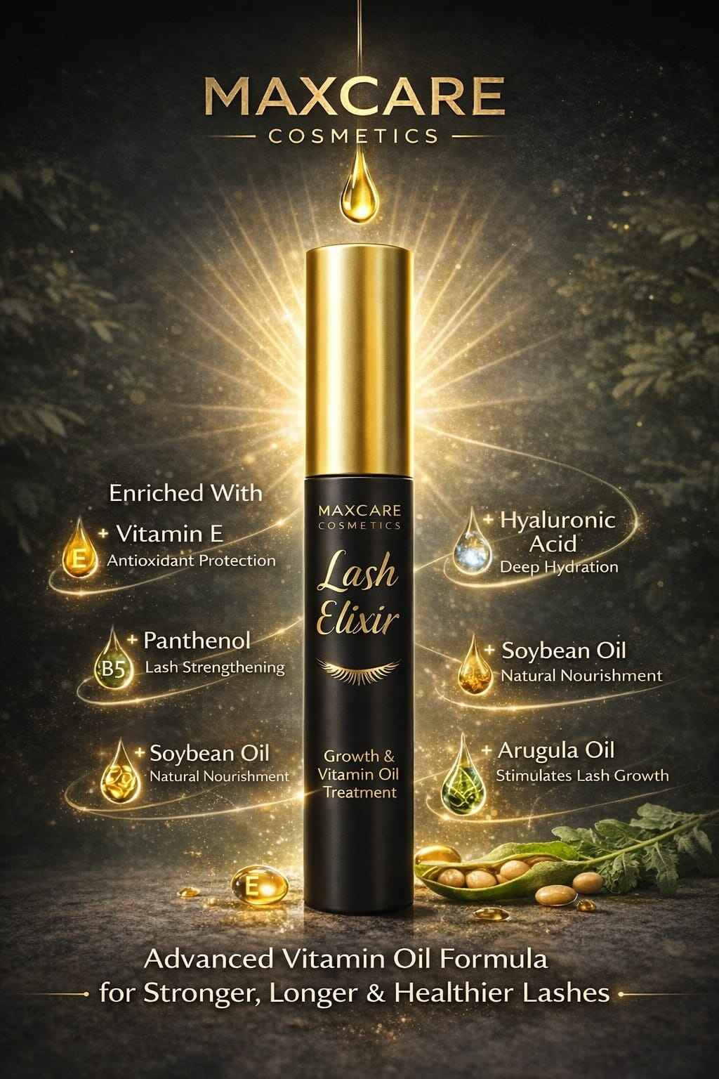 Lash Elixir من MAXCARE Cosmetics هو علاج زيتي متكامل بالفيتامينات (Vitamin Oil Treatment) مُصمَّم خصيصاً لتطويل الرموش وتكثيفها وتقويتها بشكل طبيعي. يأتي في عبوة عصا أنيقة باللون الذهبي الأسود الراقي، ويُطبَّق كالآيلاينر (eyeliner) مباشرة على قاعدة الرموش مرة واحدة يومياً.