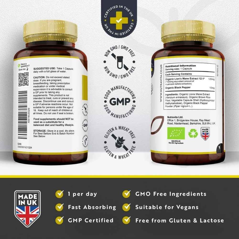 المحتوى لكل كبسولة 125 مجم مستخلص عرف الأسد العضوي (يعادل 1500 مجم فطر كامل)