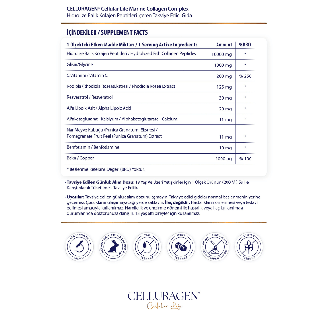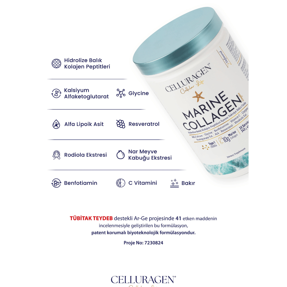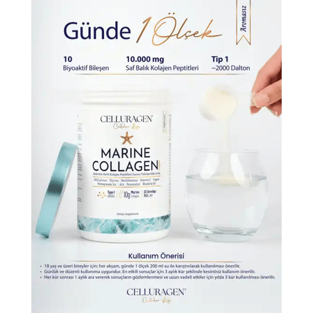منتج Celluragen Marine Collagen Complex هو مكمل غذائي متطور يحتوي على كولاجين بحري (Marine Collagen Peptides) عالي الامتصاص مع مجموعة من المركبات الداعمة لصحة الجلد والمفاصل والخلايا.