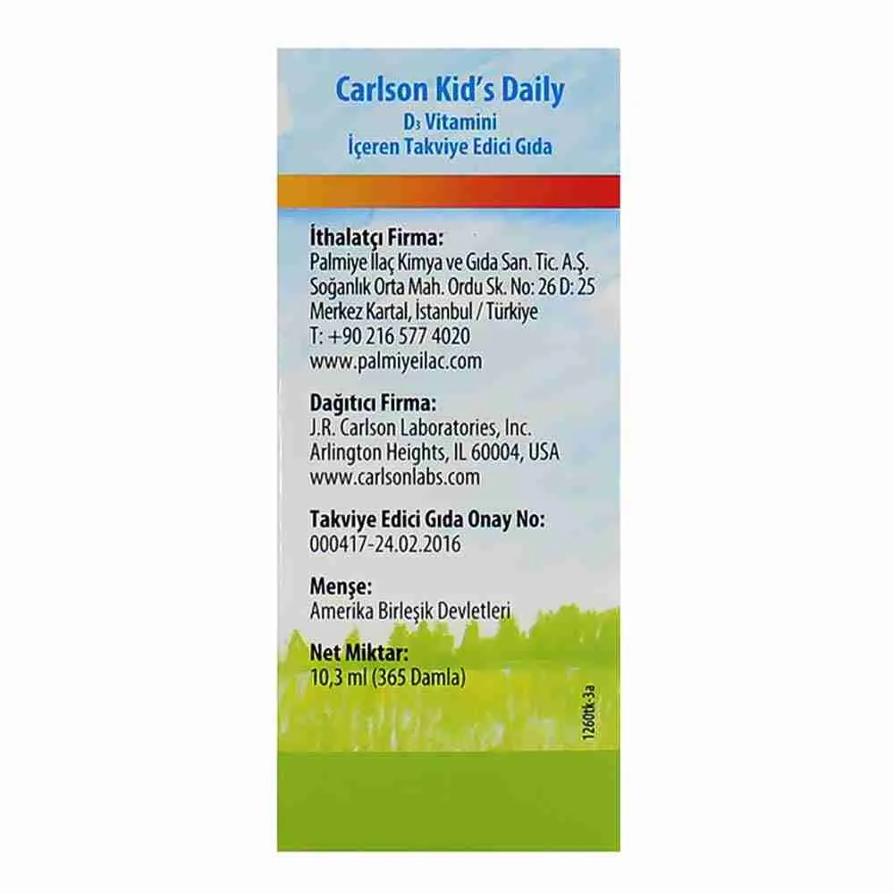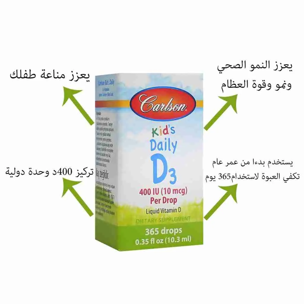 يحتوي Carlson Kid’s Daily على 400 وحدة دولية (10 ميكروغرام) من فيتامين D3 في كل قطرة.